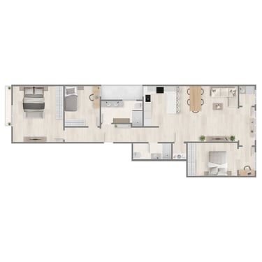 La cuina —d’alta gamma— comptarà amb una illa central, electrodomèstics integrats i gran capacitat d’emmagatzematge. A més, inclou rebost i un pràctic espai independent per a rentadora i assecadora.