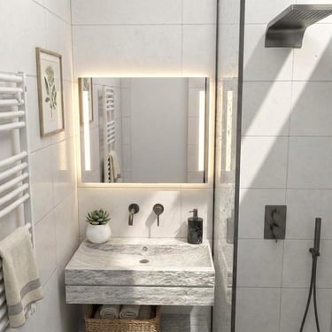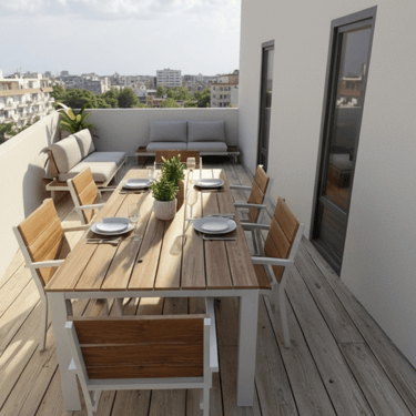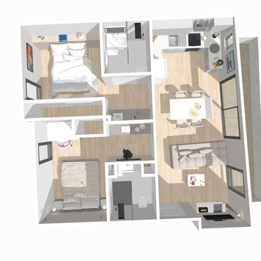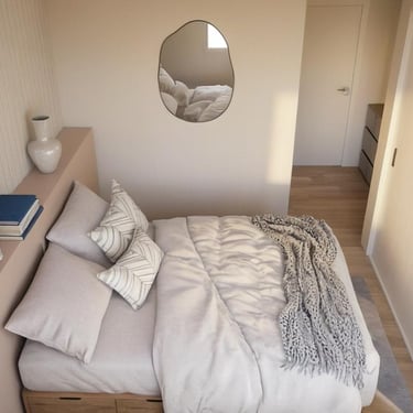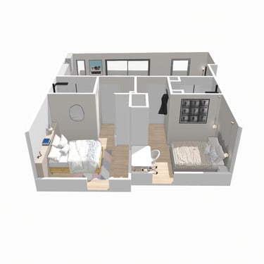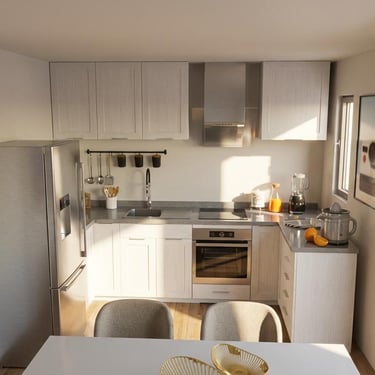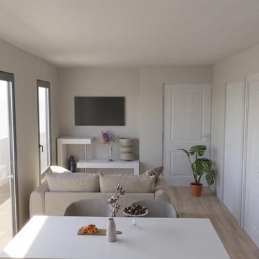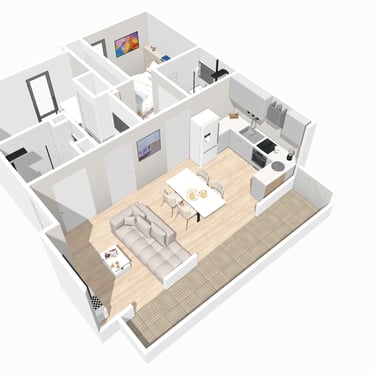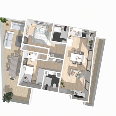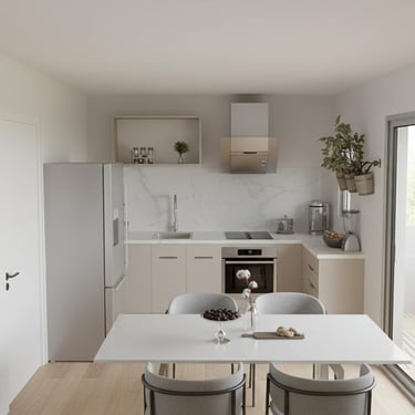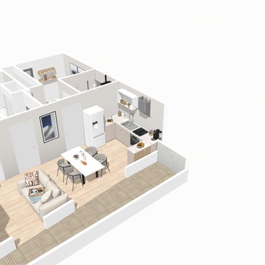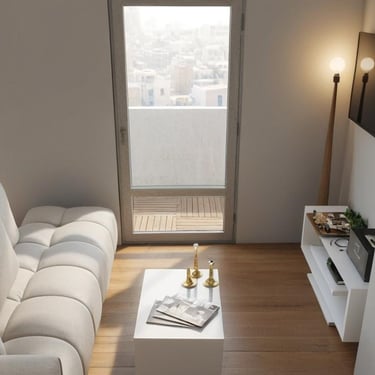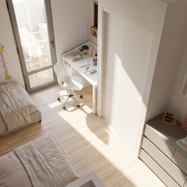 Els habitatges han estat dissenyats pensant en la comoditat i l’aprofitament òptim de l’espai. Cada unitat disposa de dues habitacions (una suite i una doble), dos banys complets, una zona d’estar amb cuina oberta integrada i sortida a balcó o pati privat, segons la planta. Els interiors s’han resolt amb criteris de modernitat i funcionalitat: terres de gres porcellànic gran format, cuines equipades amb mobles laminats i taulells de quars, portes lacades en blanc i armaris encastats. Els banys, amb plats de dutxa de resina i sanitaris suspesos, reflecteixen un acabat minimalista i de qualitat.