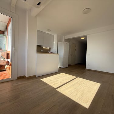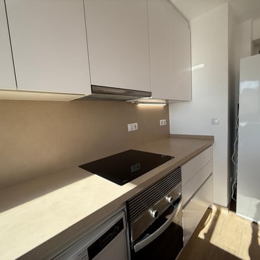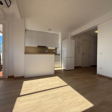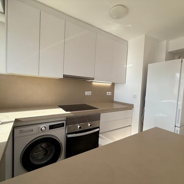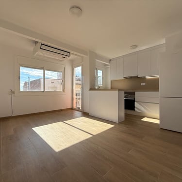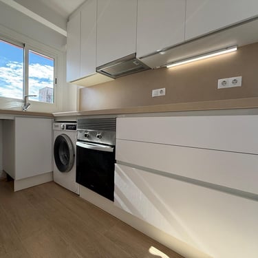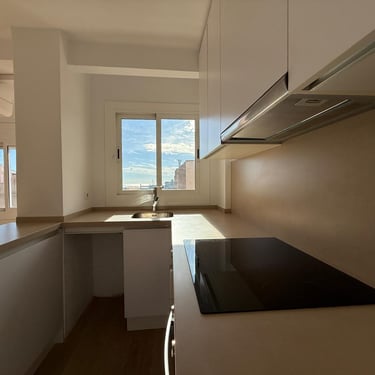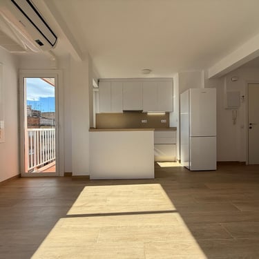 La cuina oberta, moderna i equipada amb electrodomèstics nous, s’integra perfectament amb la zona d’estar, creant un espai acollidor i funcional.