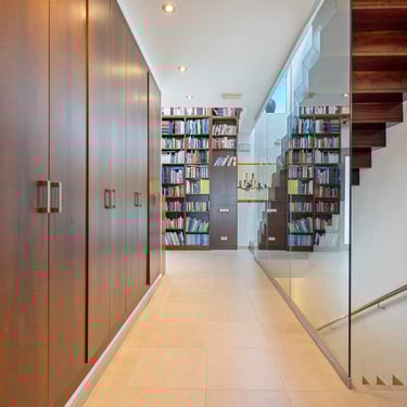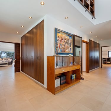 Ampli vestíbul–galeria ideal per a col·leccionistes d’art: sostres alts, parets llises i llum zenital per exposar quadres o escultures.